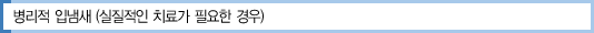 | 병리적 입냄새는 비염, 편도선염, 호흡기 장애, 소화기 장애, 간질환 등 구강 내 이상이나 체내 장기 이상으로 발생하는 경우를 말합니다. 전체 인구의 1/4 정도의 사람들이 만성적인 입냄새로 고생을 하고 있는데 이들은 본인에게서 입냄새가 나는지 인지하고 있으면서 양치질도 열심히 하지만 근본 원인이 되는 질환을 치료하지 않아 입냄새 제거를 하지 못하고 있습니다. |