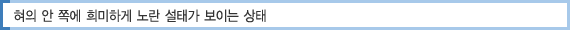 기상시나 피로할 때는 이 흰 설태의 양이 증가하고 하루 중 흰 설태의 양은 계속 변하게 됩니다. 흰 설태는 대사의 나쁜 상태나 설유두(혀 표면의 비로드 위의 구조)가 길다든가 해부학적 특징이 원인이 되며 만성화되면 혐기성균이 정착하게 되고 구취의 원인이 될 수 있습니다. |