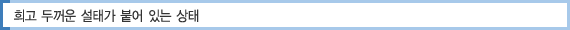 | 이른바, 구취에 과다하고 두꺼운 설태가 붙어있는 경우로 혀의 주변에까지 흰 이끼가 빽빽이 붙어 있고, 정상적인 혀 표면에 붉은 점막으로 보이던 미각 세포는 전혀 볼 수 없는 상태입니다. 만약 24시간 내내 이와 같은 상태라면 조건에 따라 구취와 관련될 수 있지만 그렇지 않을 경우 그다지 걱정할 일은 없습니다. 우리가 지독한 병이 나면 안색이 변하는 것처럼 몸 전체의 혈액 순환이 나빠지면 혀도 자줏빛이 되거나 거무칙칙하게 되고 당연히 신진 대사도 나빠져 설태가 달라 붙게 되는 것입니다. |